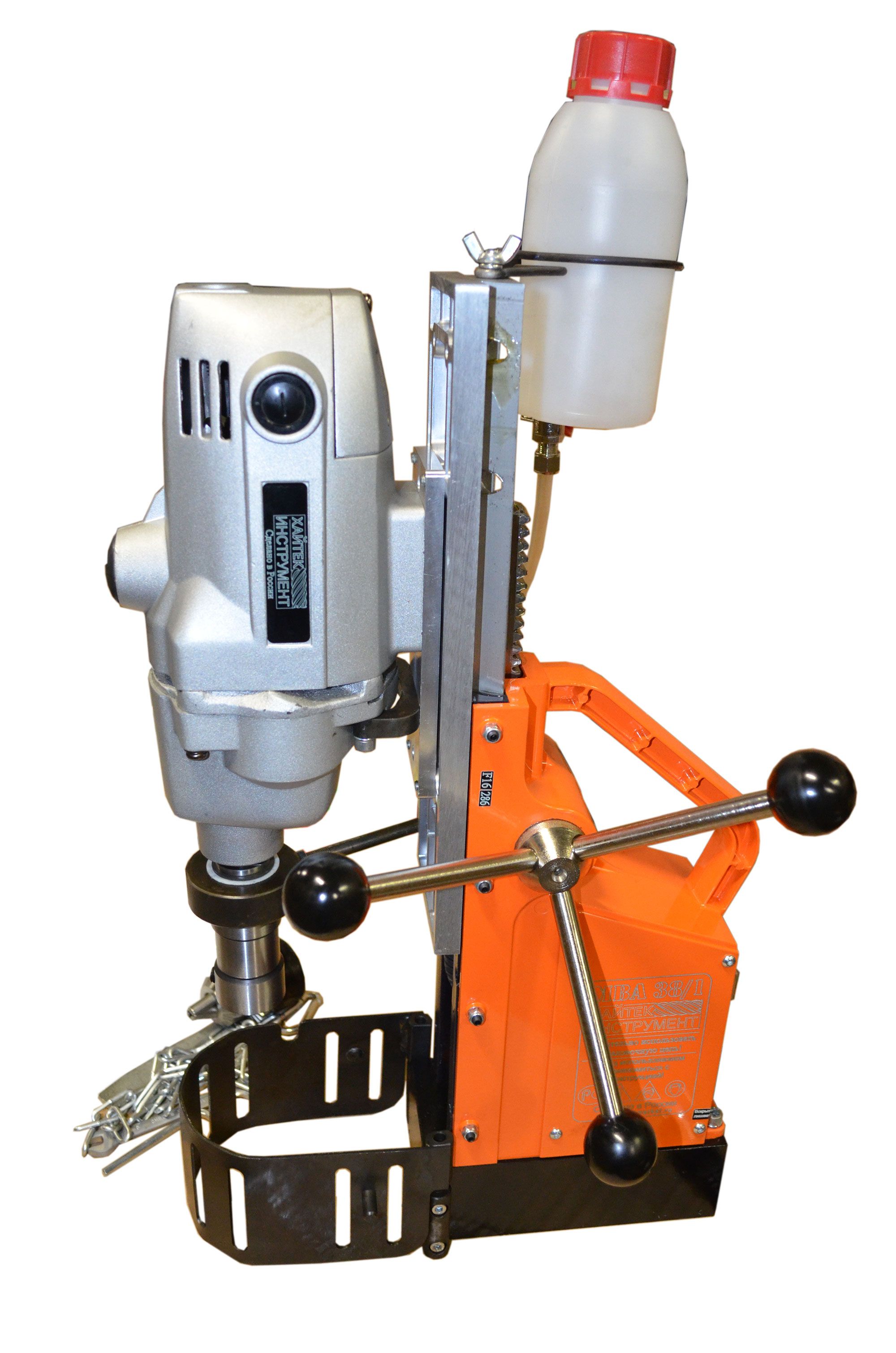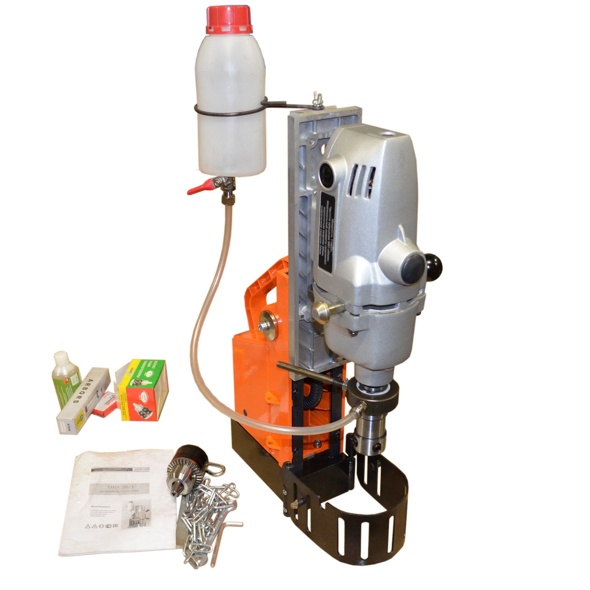 В стандартной комплектации магнитный сверлильный станок МВА38/1 оснащается держателем для корончатого сверла с хвостовиком Weldon 19, системой подачи СОЖ в центр сверла, трехкулачковым патроном для спиральных сверл с цилиндрическим хвостовиком от 3 до 16 мм.