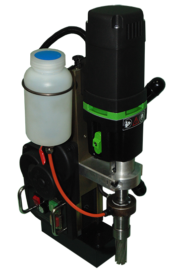 В отличие от обычного магнитного станка с ручной подачей сверла, станок с автоматической подачей оснащен специальным двигателем, который вращает вал с рукоятками. В свою очередь, конструкция вала сделана таким образом, что можно разъединять двигатель подачи и вращать его вручную. В остальном все совпадает: магнитное основание, сверлильный привод, система подачи СОЖ, держатель сверла.