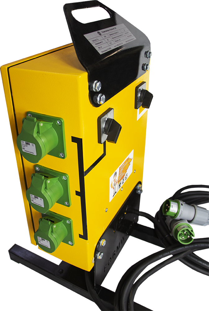 Разветвитель VPK Formwork 2/6 предназначен для подключения до 6-ти внешних вибраторов. Представляет собой коммутационное устройство с возможностью работы как от 1-ого преобразователя частоты, так и одновременно от 2-х независимых преобразователей. Для этого на входе имеются два кабеля с вилками 42В и 200 Гц. Минимальный ток каждой линии должен составлять 20 А. Каждый из двух кабелей питает группу розеток (3 шт) через группу переключателей (3 шт) для подключения шести внешних вибраторов.