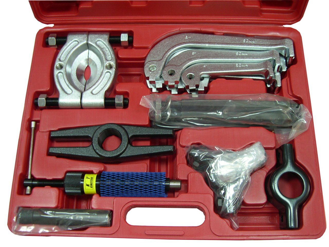 Набор состоит из различных съемников, сепараторов для работы с 10 тонным гидравлическим цилиндром. Набор подходит для извлечения различного рода подшипников, шкивов, шестеренок и других деталей автомобиля. Благодаря прочной конструкции и большому усилию гидравлического цилиндра, съемник можно использовать для обслуживания грузовых машин, сельскохозяйственной и строительной техники, а так же в промышленности. При необходимости, можно использовать удлинительные штанги для сепараторного съёмника и удлинительные штанги для центрального штока цилиндра.